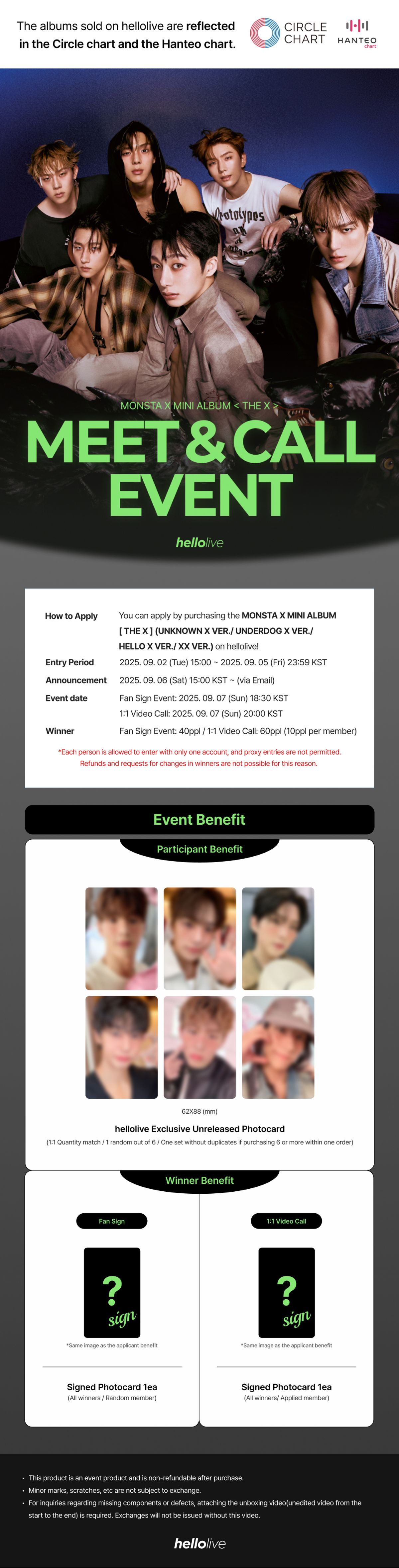 📆 Entry Period 2025. 09. 02 (Tue) 15:00 ~ 2025. 09. 05 (Fri) 23:59 KST ⏰ Event Date & Time Fan Sign Event: 2025. 09. 07 (Sun) 18:30 KST 1:1 Video Call Event: 2025. 09. 07 (Sun) 20:00 KST 📍Winner Annoucement 2025. 09. 06 (Sat) 15:00 KST ~ (via Email) Fan Sign Event - 40ppl / 1:1 Video Call - 10ppl per member