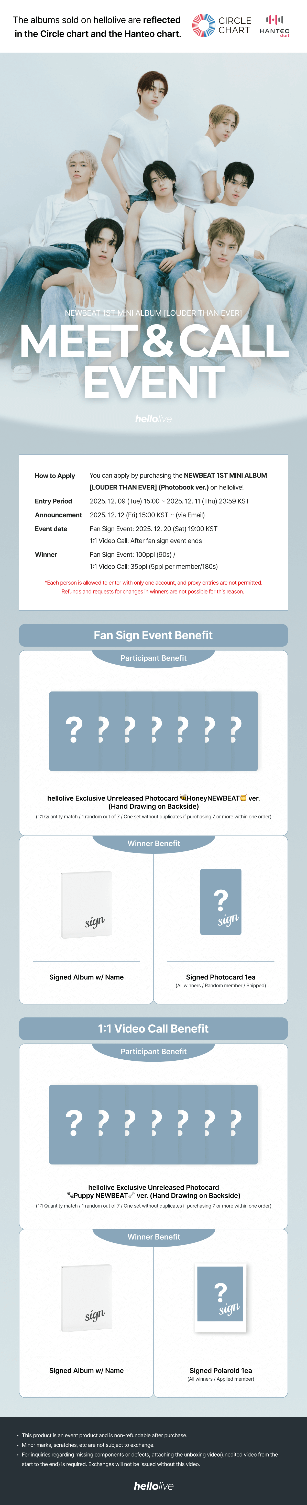 ⏰ Event Date & Time - Fan Sign Event: 2025. 12. 20 (Sat) 19:00 KST - 1:1 Video Call: After fan sign event ends 📆 Entry Period 2025. 12. 09 (Tue) 15:00 ~ 2025. 12. 11 (Thu) 23:59 KST 📍Winner Announcement 2025. 12. 12 (Fri) 15:00 KST ~ (via Email) 🙋Winner - Fan Sign Event: 100ppl - 1:1 Video Call: 5ppl per member