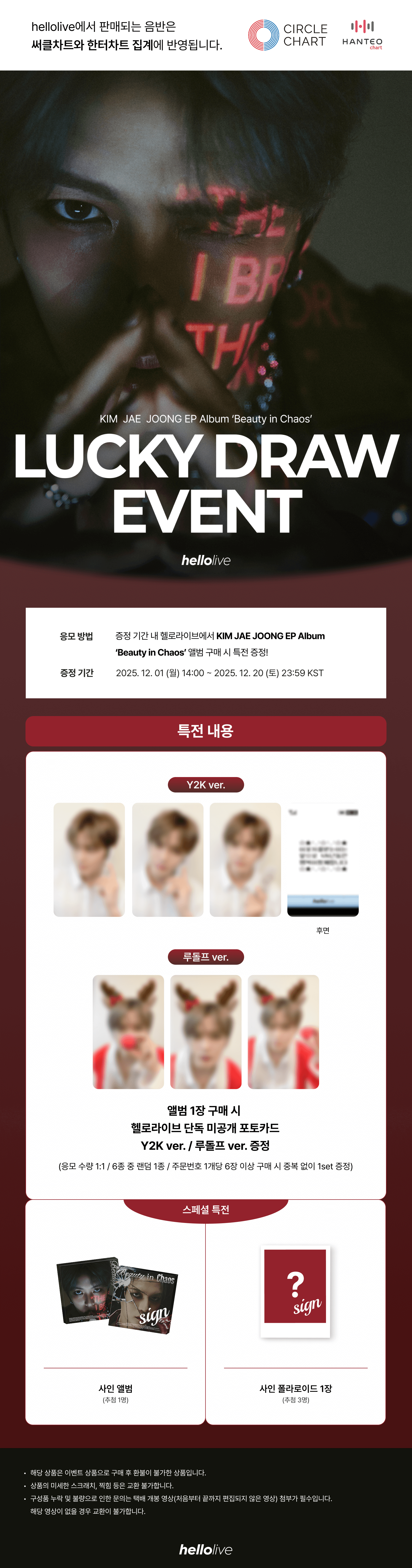 📆 응모기간 2025. 12. 01 (월) 14:00 ~ 2025. 12. 20 (토) 23:59 KST 🔎 응모자 특전 앨범 1장 구매 시 헬로라이브 단독 미공개 포토카드 Y2K ver. / 루돌프 ver. 증정 구매자 추첨 3명 사인 폴라로이드 증정 구매자 추첨 1명 사인 앨범 증정