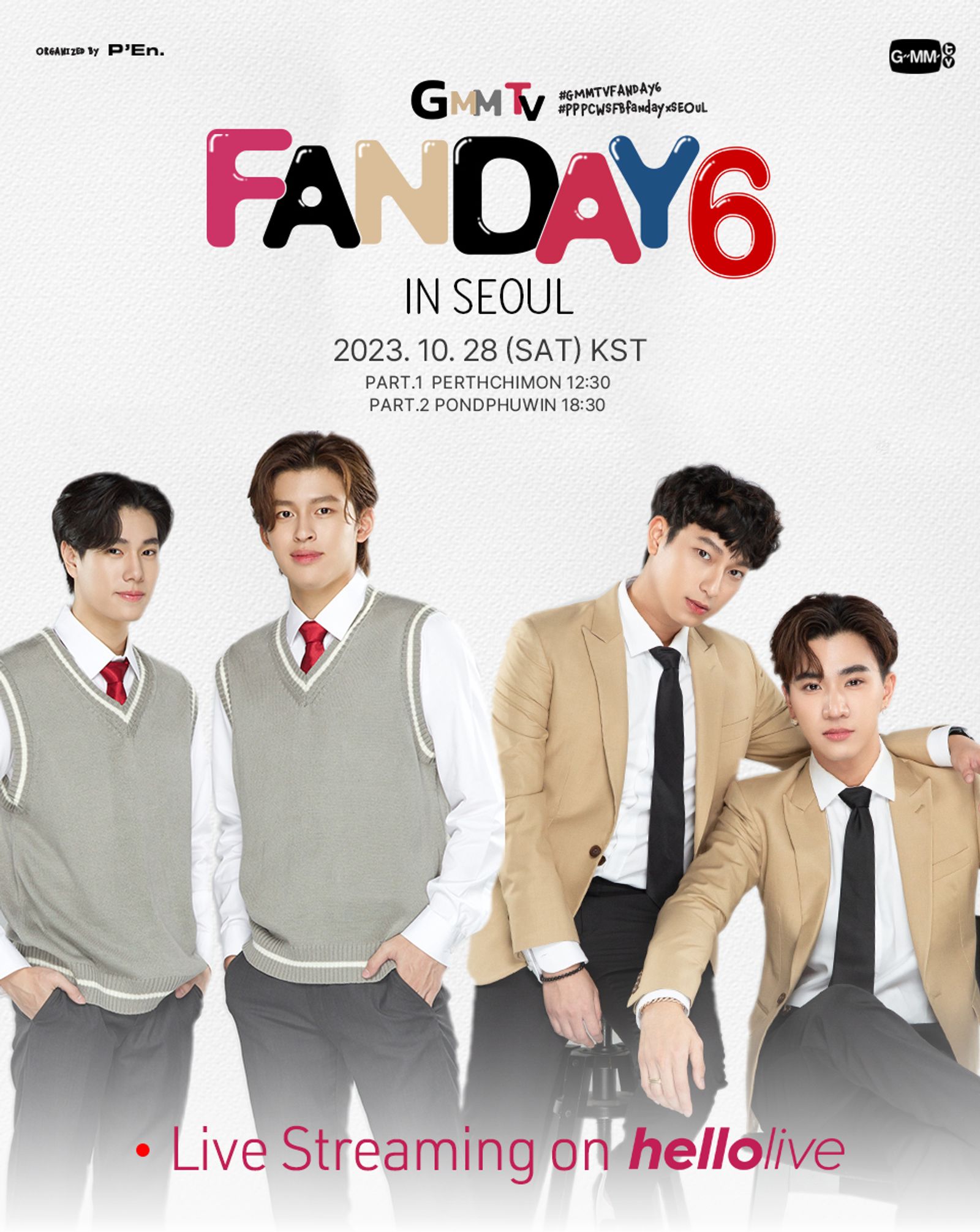 ⏰ Date&Time PART 1. : 2023. 10. 28 (Sat) 12:30 KST PART 2. : 2023. 10. 28 (Sat) 18:30 KST 🎞 Running time 90 minutes each 🎫 Ticket Open 2023. 09. 26 (Tue) 18:00 ~ 2023. 10. 28 (Sat) 20:00 KST 🔍 Hosted/Organized Hosted: GMMTV Organized: P'En