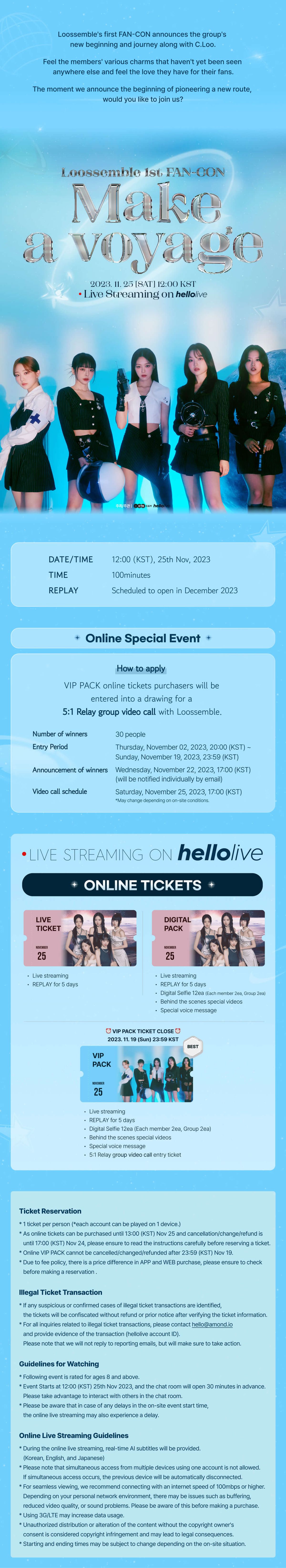 ⏰ Date&Time 2023. 11. 25 (Sat) 12:00 KST 🎞 Running time 100min 🎫 Ticket Open 2023. 11. 03 (Fri) 20:00 KST~ 🔍 Hosted/Organized CTDE&M / hellolive
