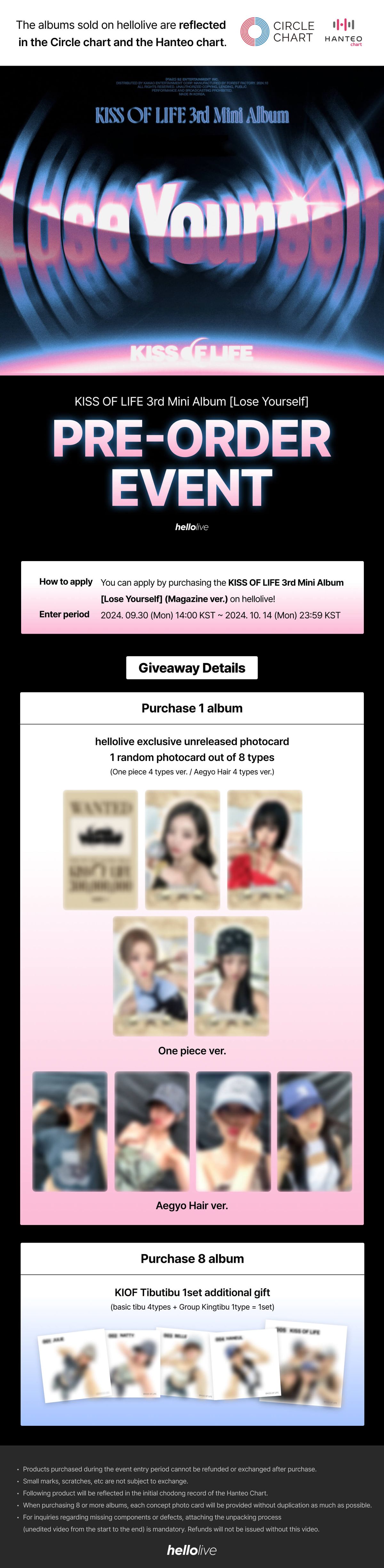 🖤[PRE-ORDER EVENT] KISS OF LIFE 3rd Mini Album [Lose Yourself] (Magazine ver.) ‘Conversion Part.1’ release commemorative pre-order benefit giveaway event 📆 Pre-order Period ~ 2024. 10. 14 (Mon) 23:59 KST 🎉 Giveaway Items 🌟 One random photocard out of 8 unreleased exclusive photocards from Hellolive will be gifted! 🌟 Purchase more than 8 copies and receive an additional set of "Tibutubuseal" stickers.