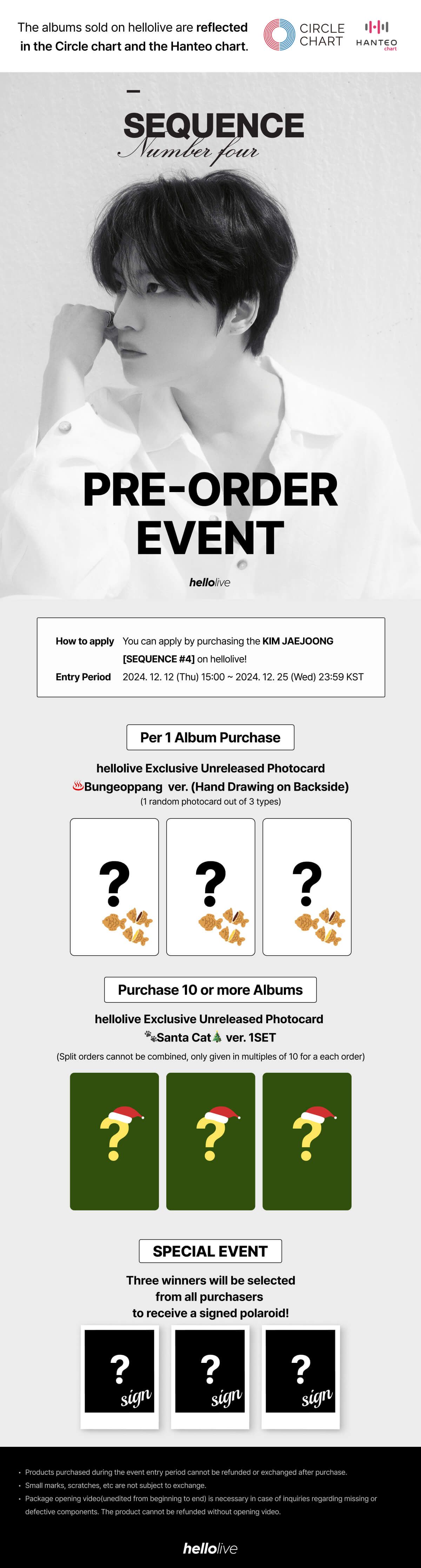 [PRE-ORDER EVENT] KIM JAEJOONG [SEQUENCE #4] 📆 Pre-order Period 2024. 12. 12 (Thu) 15:00 ~ 2024. 12. 25 (Wed) 23:59 KST 🎉 Giveaway ✔ When purchasing 3 or more, ♨️Bungeoppang ver. photocard will be provided without duplicates! ✔ 🐾 Sa1nta Cat 🎄 ver. photocard set with the purchase of 10 or more!