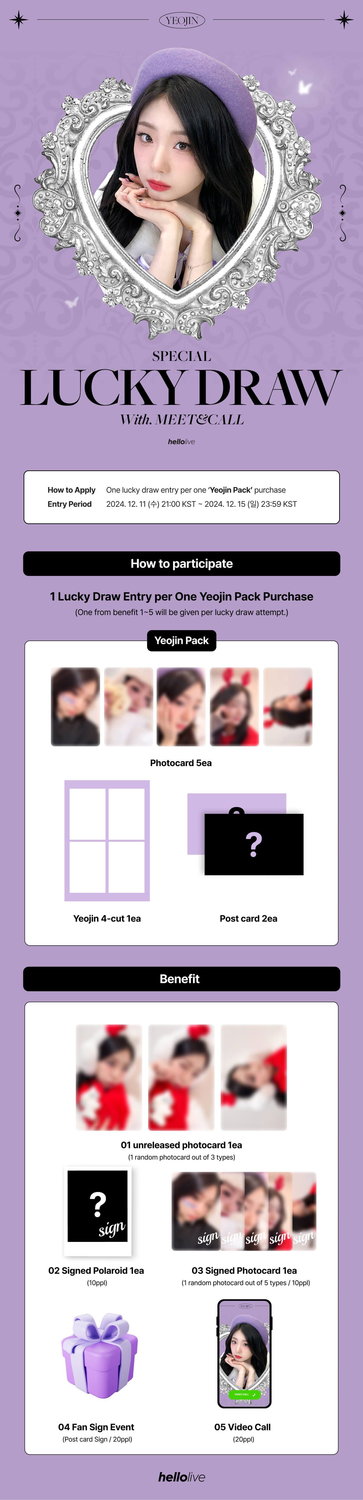 📆 Entry Period 2024. 12. 11 (Wed) 21:00 KST ~ 2024. 12. 15 (Sun) 23:59 KST 💜 Yeojin Pack Photocard 5ea + Yeojin4cut 1ea + Post card 2ea 🎁 LUCKYDRAW 1. unreleased photocard (1 random photocard out of 3 types) 2. Signed Polaroid 1ea (10ppl) 3. Signed Photocard (10ppl) 4. Fan Sign Event (20ppl) 5. Video Call (20ppl) ⏰ FAN SIGN & VIDEO CALL Winner : 2024. 12. 16 (Mon) Individual Notification of E-mail Fan Sign Event : 2024. 12. 20 (Fri) 19:00 KST Video Call : After the Fan Sign Event ends