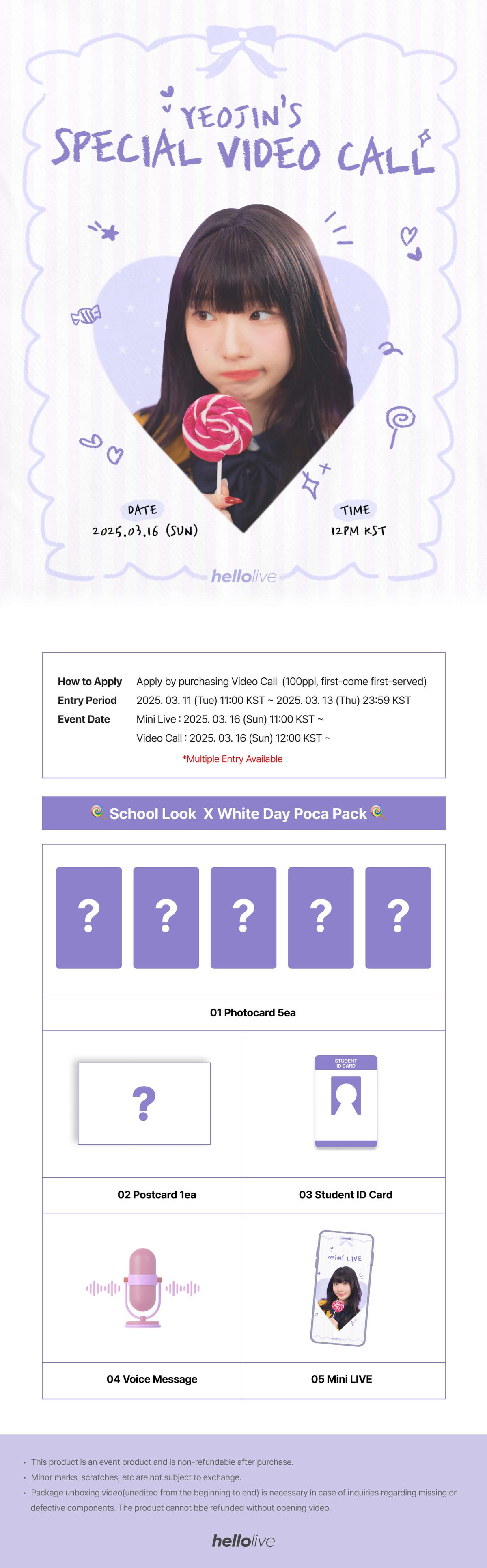 📆 Entry Period 2025. 03. 11 (Tue) 11:00 ~ 2025. 03. 13 (Thu) 23:59 KST ⏰ Event Date Video Call : 2025. 03. 16 (Sun) 12:00 KST~ 🎥 MINI LIVE Schedule Live Schedule: 2025. 03. 16 (Sun) 11:00 KST~ 📍 Winner Announcement Video Call Event - 100ppl (80sec)