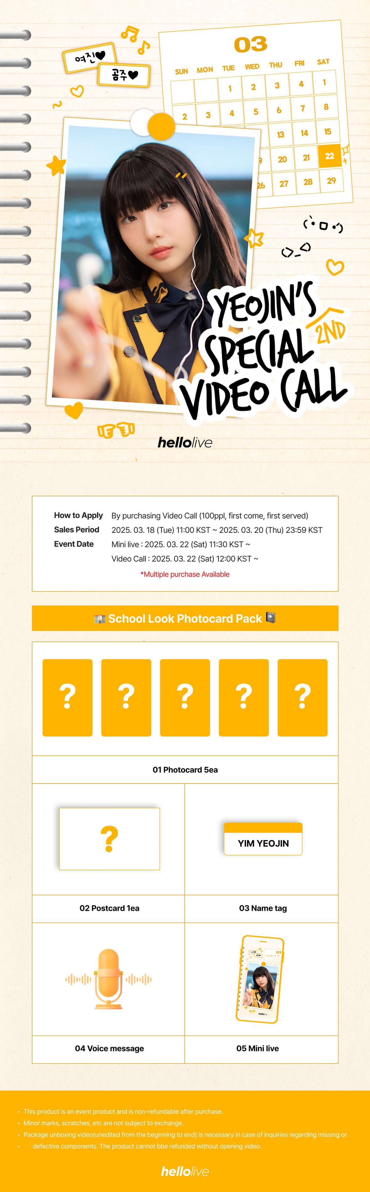 📆 Entry Period 2025. 03. 18 (Tue) 11:00 ~ 2025. 03. 20 (Thu) 23:59 KST ⏰ Event Date Video Call: 2025. 03. 22 (Sat) 12:00 KST~ 🎥 MINI LIVE Schedule Live Schedule: 2025. 03. 22 (Sat) 11:30 KST~ 📍Video Call Event - 100ppl (80sec) This event is limited to 100ea and may sell out early.