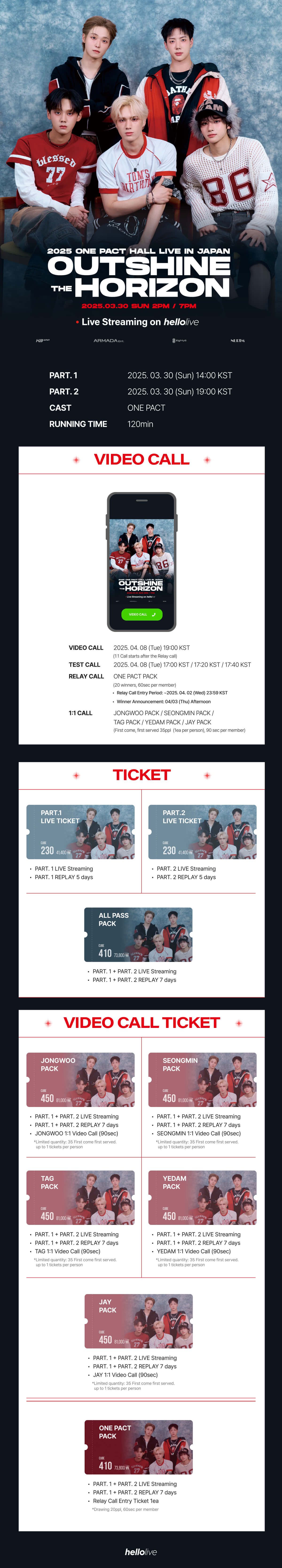 ⏰ DATE&TIME PART.1: 2025. 03. 30 (Sun) 14:00 KST PART.2: 2025. 03. 30 (Sun) 19:00 KST 🎞 RUNNING TIME 120minutes 📞VIDEO CALL DATE 2025. 04. 08 (Tue) 19:00 KST (1:1 Call starts after the Relay call) 🎫 TICKET OPEN 2025. 03. 19 (Wed) 12:00 KST ~ ※ VIDEO CALL TICKET: 2025. 03. 20 (Thu) 18:00 KST ~ *The sales period varies depending on the product. 🔍 Hosted/Organized ARMADA ENT