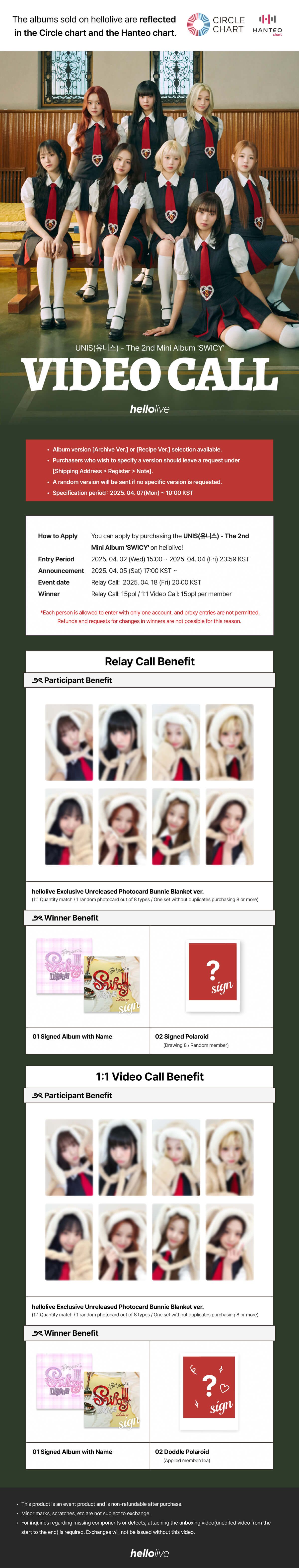 9) 사인을 받으실 앨범은 비디오콜 현장에서 준비될 예정이며, 사인은 UNIS(유니스) - The 2nd Mini Album 'SWICY' 에만 받으실 수 있습니다.