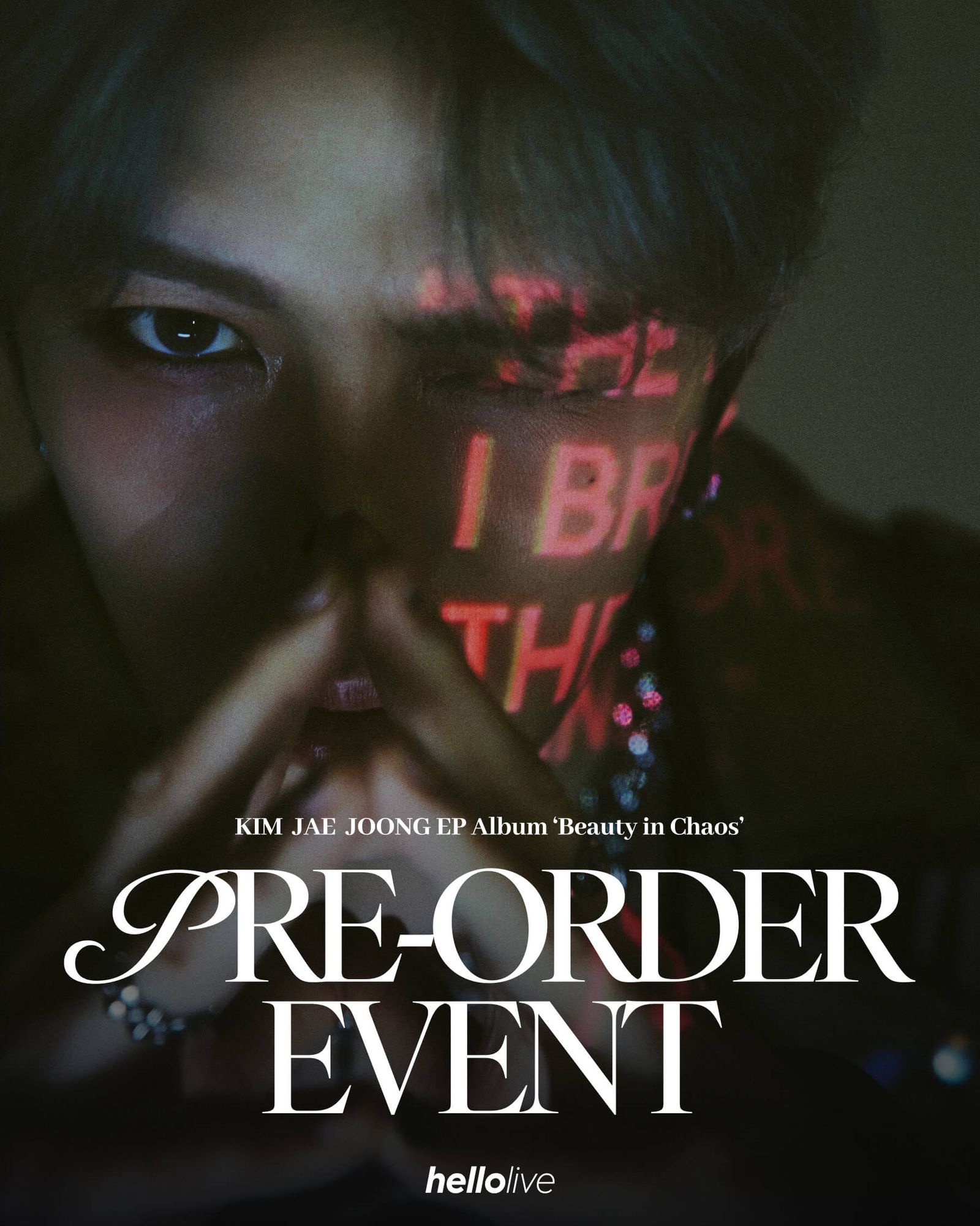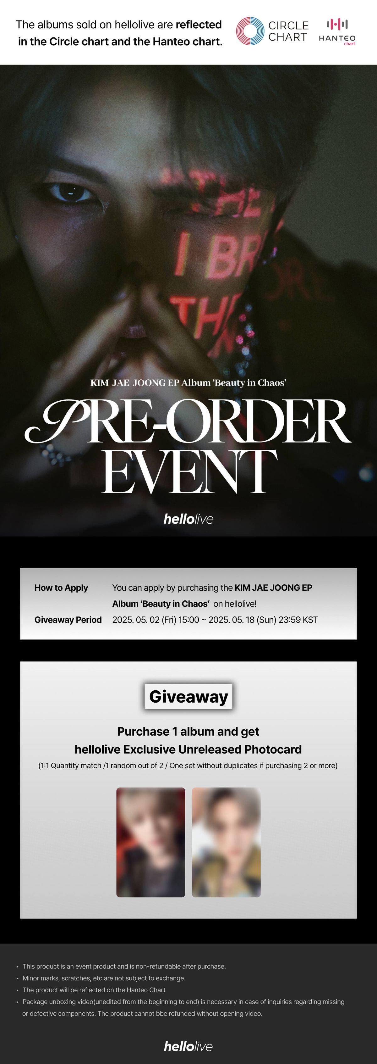 [PRE-ORDER EVENT] KIM JAE JOONG 'Beauty in Chaos' Pre-Order Giveaway Event 📆Pre-order Period 2025. 05. 02 (Fri) 15:00 ~ 2025. 05. 18 (Sun) 23:59 KST 🎉Giveaway🎉 hellolive Exclusive Unreleased Selfie Photocard (1 random out of 2)