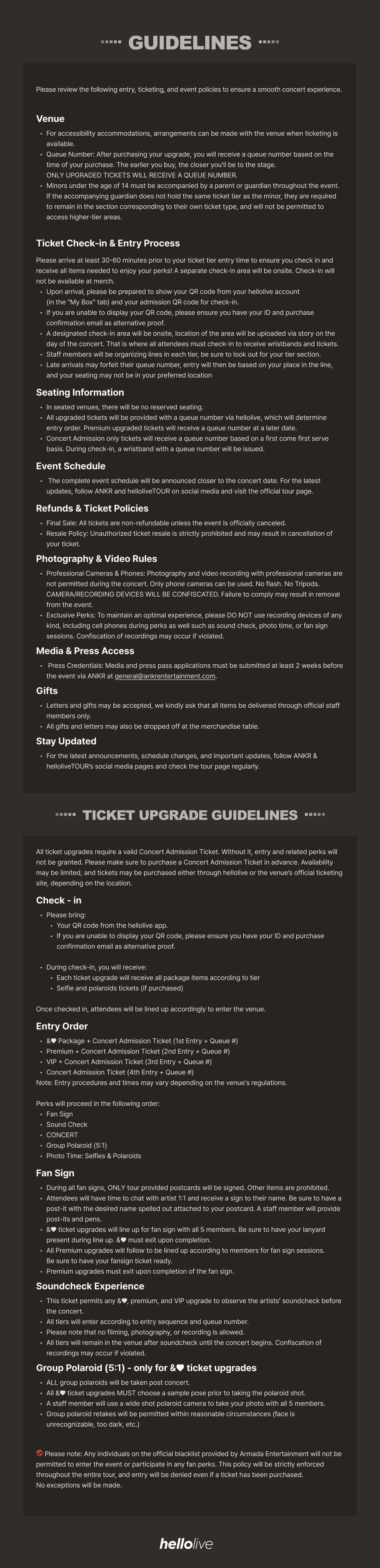 ✔️All ticket upgrades require a valid Concert Admission Ticket. Without it, entry and related perks will not be granted. Please make sure to purchase a Concert Admission Ticket in advance. Availability may be limited, and tickets may be purchased either through hellolive or the venue’s official ticketing site, depending on the location.