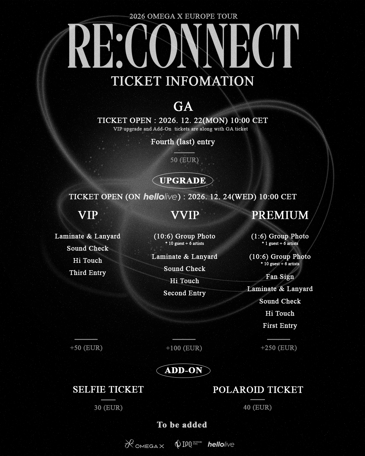 📢 This is the main page for CONCERT of 2026 OMEGA X EUROPE TOUR [RE:CONNECT]. Additional event details and further information will be updated soon. ✔️ A valid Concert Admission ticket is required to participate in VIP Upgrades. Without it, entry and related benefits will not be granted. Please make sure to purchase a Concert Admission Ticket in advance. *GA tickets will be available on the venue’s official website. ✅ Please check each city's detail page for ticket reservations. 📍 Paris — 10 February 2026 📍 Frankfurt — 12 February 2026 📍 Berlin — 15 February 2026 📍 Warsaw — 17 February 2026 📍 Budapest — 20 February 2026 📍 Helsinki — 22 February 2026 📍 Milan — 24 February 2026 🔜 Details for the OFF STAGE event in Vienna will be announced soon. 🔍 Hosted / Organized IPQ Inc. / hellolive Inc.