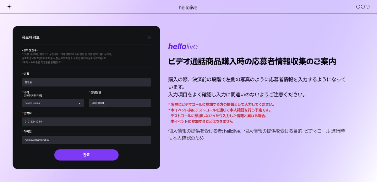 4) VIDEOCALLイベントは、応募時に個人情報収集同意手続きを通じて収集されたhellolive登録アカウントでのみ実施できます。(応募後、変更不可)