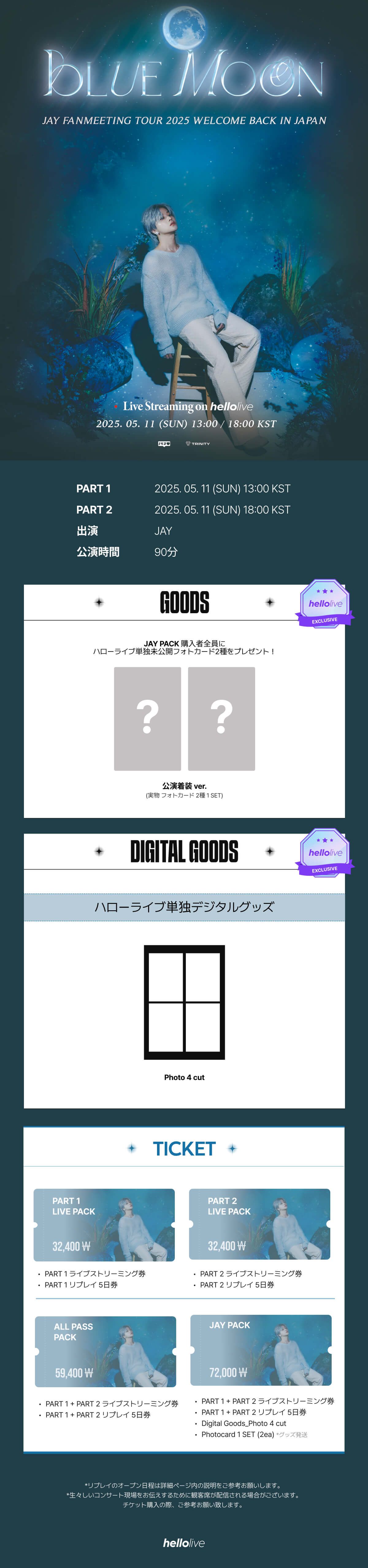 ⏰ 公演日時 PART 1: 2025. 05. 11 (日) 13:00 KST PART 2: 2025. 05. 11 (日) 18:00 KST 🎞 公演時間(予定) 90分 🎫 チケット販売 2025. 04. 29 (火) 18:00 KST ~ 2025. 05. 25 (日) 23:59 KST 🔍 主催 : 143 ENTERTAINMENT , TRINITY