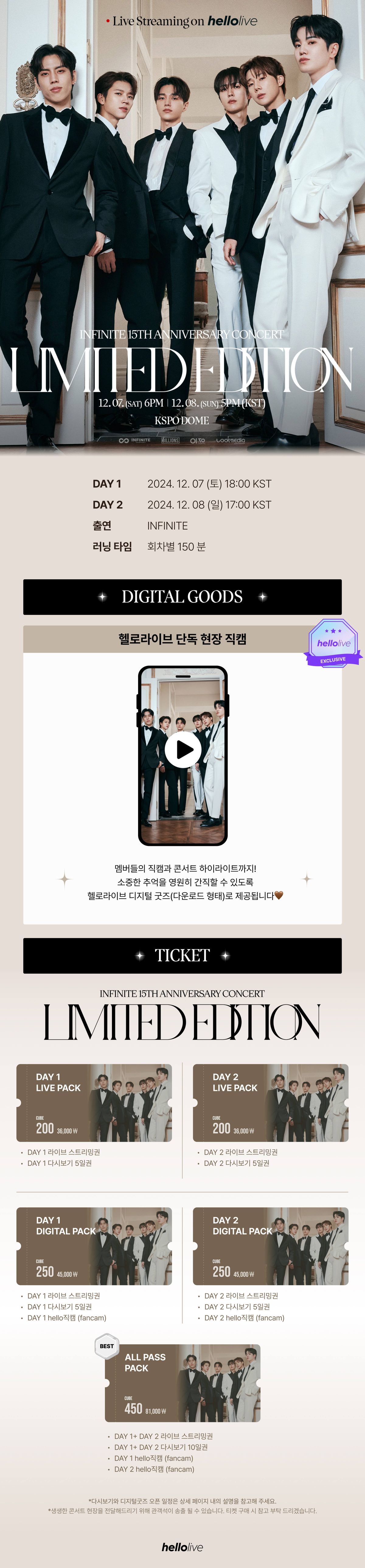 ⏰ 공연일시 DAY 1 : 2024. 12. 07 (토) 18:00 KST DAY 2 : 2024. 12. 08 (일) 17:00 KST 🎞 러닝 타임 150분 🎫 티켓 판매 2024. 11. 15 (금) 18:00 KST ~ 2024. 12. 22 (일) 23:59 KST 🔍 주최/주관 인피니트컴퍼니