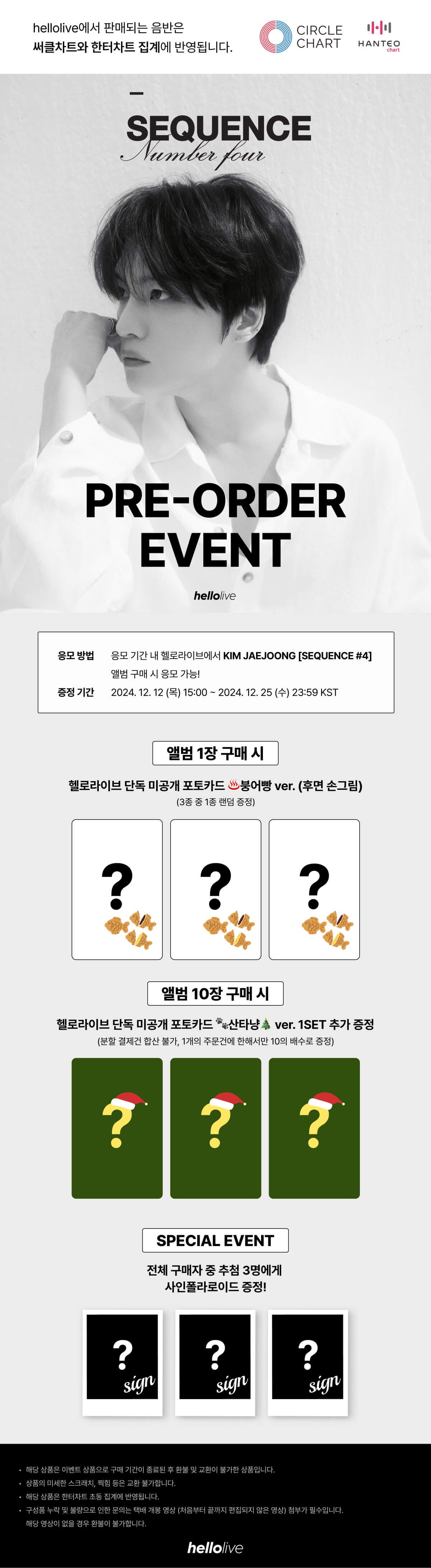 [PRE-ORDER EVENT] KIM JAEJOONG [SEQUENCE #4] 📆 예약 판매 기간 2024. 12. 12 (목) 15:00 ~ 2024. 12. 25 (수) 23:59 KST 🎉 증정 항목 ✔ 3장 이상 구매 시 ♨️붕어빵 ver. 포토카드 중복 없이 증정! ✔ 10장 이상 구매 시 포토카드 🐾산타냥🎄 ver. 1SET 추가 증정!