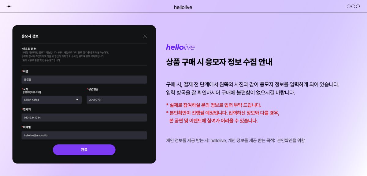 4) VIDEO CALL 이벤트는 응모 시 개인정보 수집 동의 절차를 통해 수집된 hellolive 가입 계정으로만 진행 가능합니다. (응모 후 변경 불가)