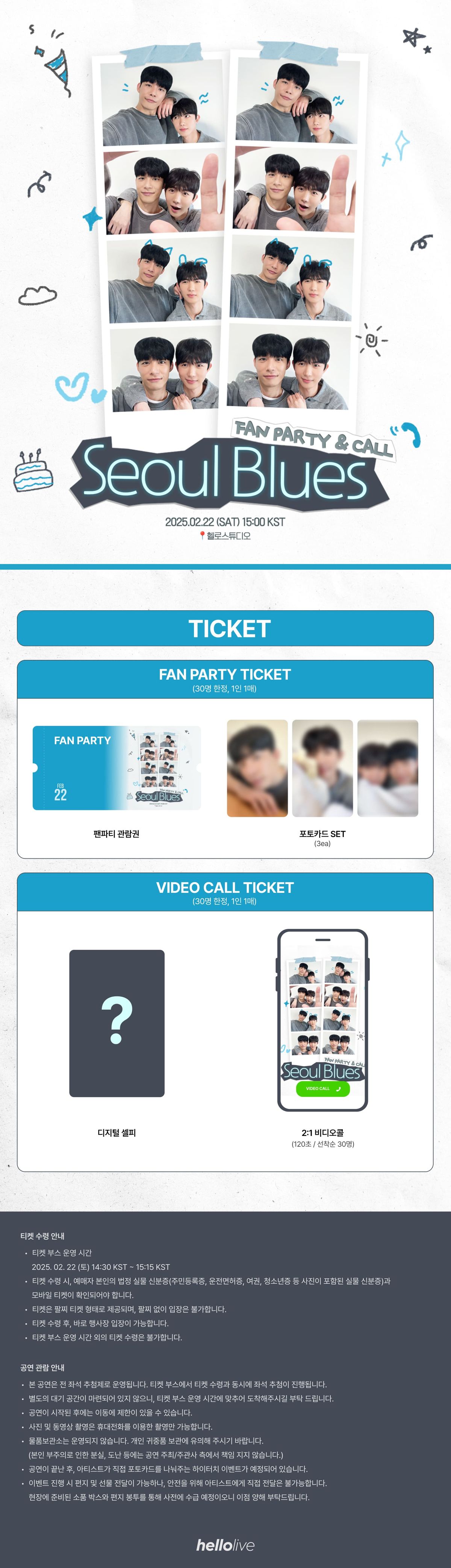 ⏰ 이벤트 일시 - 팬파티 : 2025. 02. 22 (토) 15:00 KST - 2:1 비디오콜 : 2025. 02. 22 (토) 18:00 KST 🏫팬파티 장소 헬로 스튜디오 (서울특별시 강남구 봉은사로 43길 45 2층) 🎞 러닝 타임 90분 🙋♀️ 참여 인원 팬파티 : 선착순 30명 2:1 비디오콜 : 선착순 30명 / 120초 🎫 티켓 판매 - FAN PARTY TICKET 2025. 02. 06 (목) 18:00 KST - VIDEO CALL TICKET 2025. 02. 06 (목) 18:30 KST