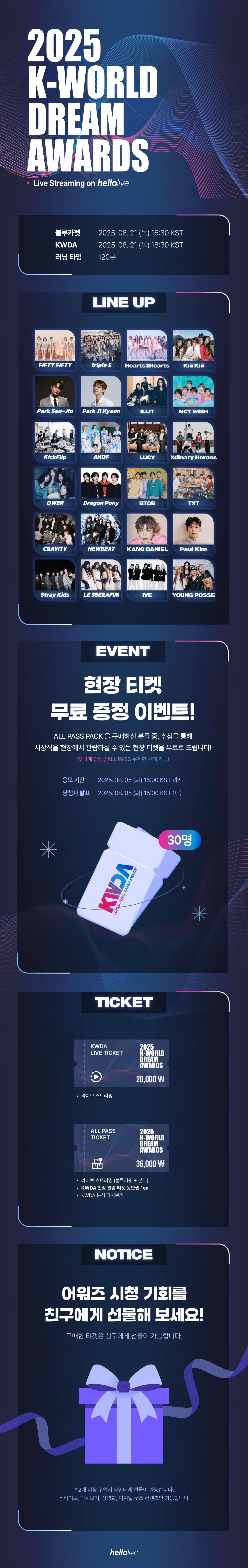 📢 리플레이 티켓 구매시 다시보기를 바로 시청할 수 있습니다. 🎫 이미 ALL PASS TICKET을 구매하신 분은 리플레이 티켓 구매없이 다시보기를 이용하실 수 있습니다. [다시보기 콘텐츠와 티켓 구성] 1️⃣ Blue Carpet 2️⃣ Awards REPLAY TICKET (KWDA) = 2️⃣ REPLAY TICKET (ALL PASS) 1️⃣ + 2️⃣ 💖 라인업 AHOF / BTOB / CRAVITY / Dragon Pony / FIFTY FIFTY / Hearts2Hearts / ILLIT / IVE / KANG DANIEL / KickFlip / KiiiKiii / LE SSERAFIM / LUCY / NCT WISH / NEWBEAT / Paul Kim / QWER / Stray Kids / tripleS / Xdinary Heroes