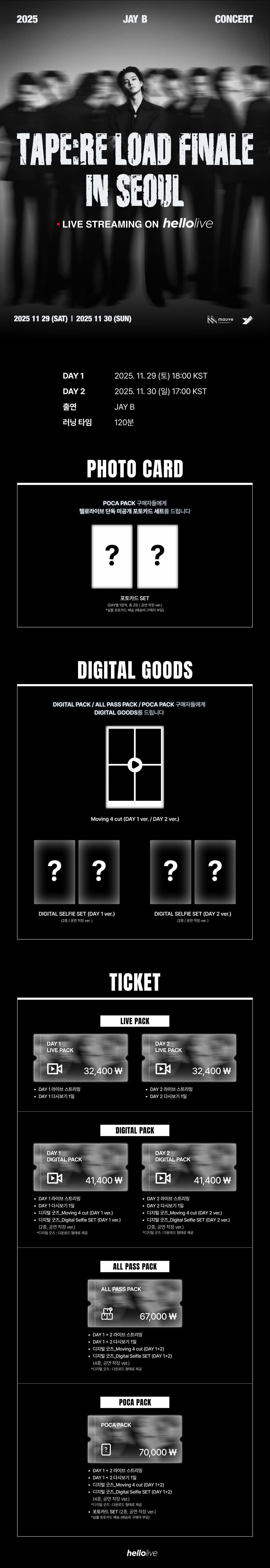 ⏰ 공연일시 DAY 1 : 2025. 11. 29 (토) 18:00 KST DAY 2: 2025. 11. 30 (일) 17:00 KST 🎞 러닝 타임 120분 🎫 티켓 판매 2025. 11. 10 (월) 18:00 KST ~ 2025. 12. 14 (일) 23:59 KST 🔍 주최/주관 YJ 파트너스, (주)모브컴퍼니