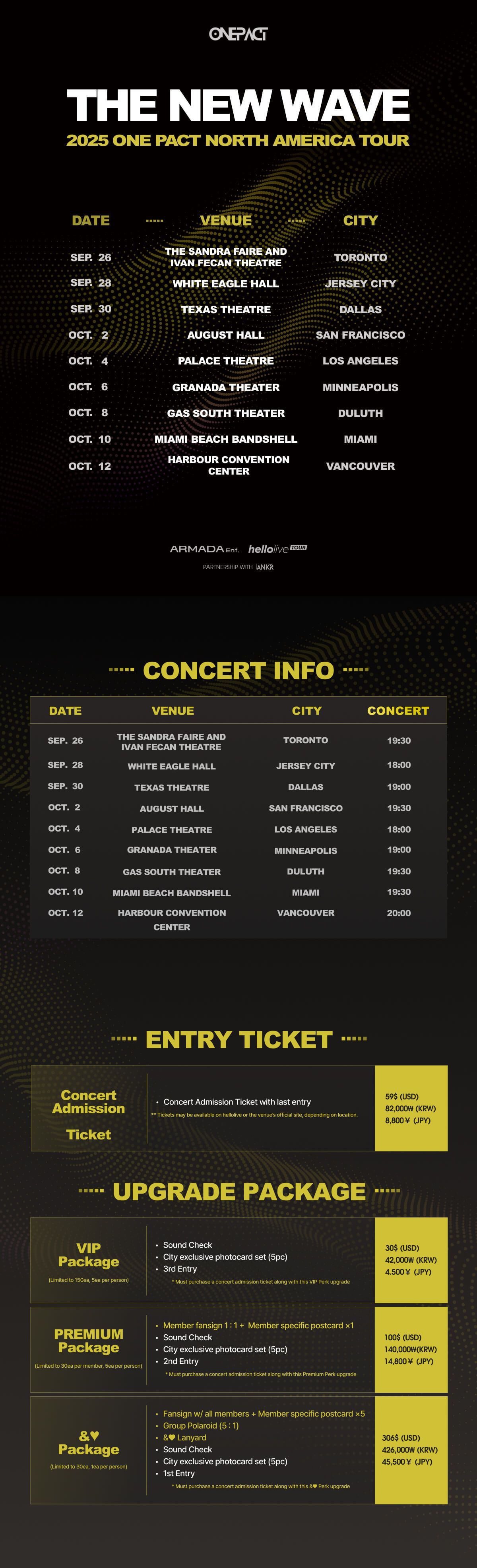 📢 This is the main page for 2025 ONE PACT NORTH AMERICA TOUR [THE NEW WAVE]. ✅ Please check each city's detail page for ticket reservations. 📍 Toronto, ON, Canada — SEP 26, 2025 📍 Jersey City, NJ, USA — SEP 28, 2025 📍 Dallas, TX, USA — SEP 30, 2025 📍 San Francisco, CA, USA — OCT 2, 2025 📍 Los Angeles, CA, USA — OCT 4, 2025 📍 Minneapolis, MN, USA — OCT 6, 2025 📍 Duluth, GA, USA — OCT 8, 2025 📍 Miami, FL, USA — OCT 10, 2025 📍 Vancouver, BC, Canada — OCT 12, 2025