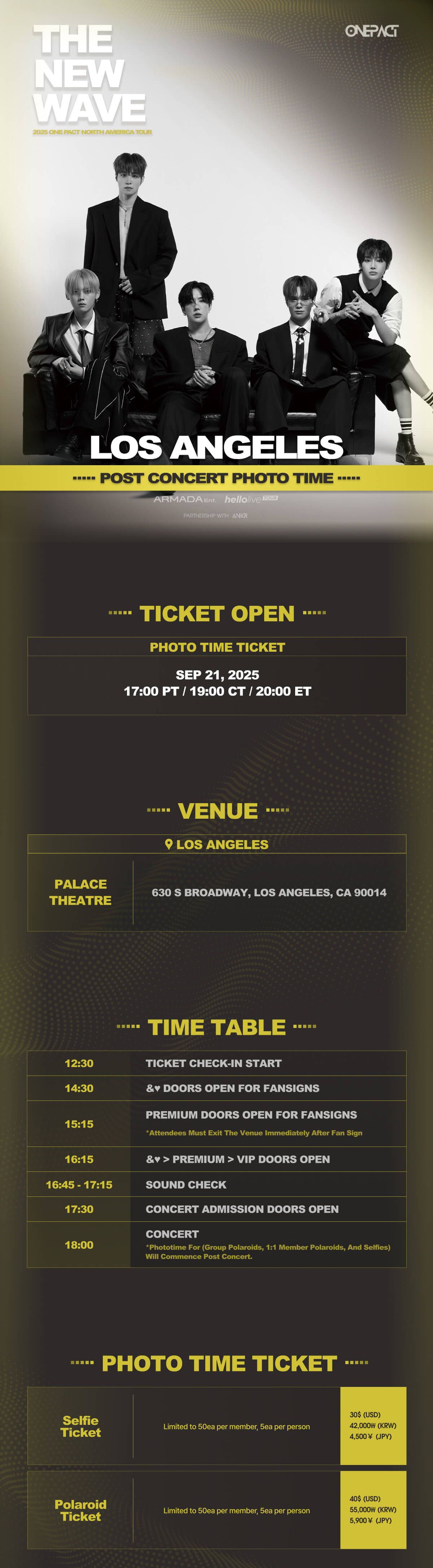 📸 Photo-Time with ONE PACT in Los Angeles🤍 ✅ Los Angeles, CA, USA — OCT 4, 2025 ⏰ All photo-time perks will start after the main concert has concluded. < Photo-Time Schedule > 1. Group Polaroid (5:1) (&♥ Package holders) 2. 1:1 Polaroids 3. 1:1 Selfies 📍 LOCATION Palace Theatre (630 S Broadway, Los Angeles, CA 90014) 🎫 TICKET OPEN SEP 21, 2025 | 17:00 PT / 19:00 CT / 20:00 ET 🔍 Hosted/Organized ARMADA ENT / hellolive