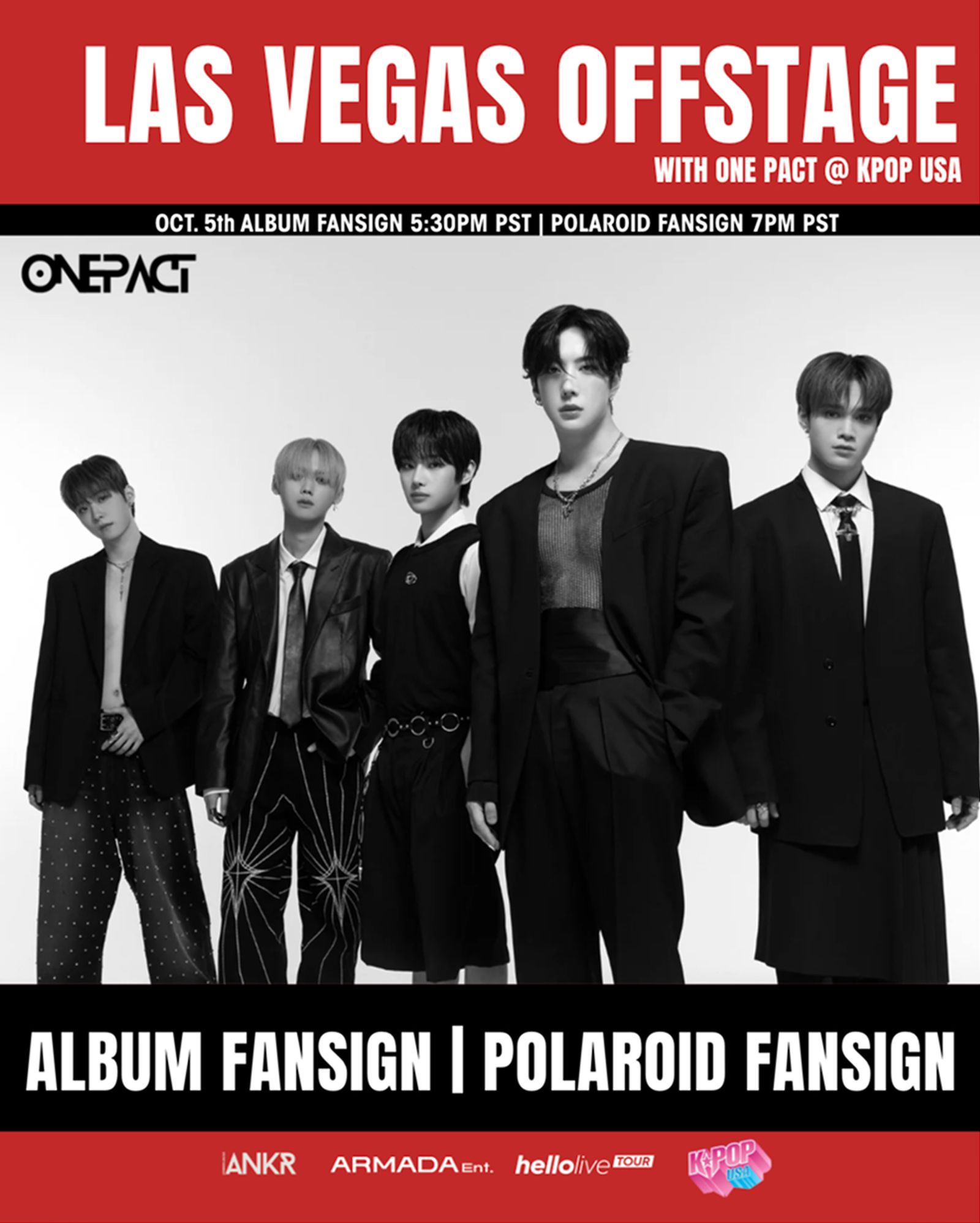 💿 Fansign Events 📸 with ONE PACT in Las Vegas🤍 ✅ Las vegas, NV, USA — OCT 5, 2025 ⏰ Perks will proceed in the following order: - 5:1 Fast Track ALBUM FANSIGN > 17:30 ~ 18:30 - 1:1 POLAROID + FANSIGN > 19:00 - 20:00 📍 LOCATION KPOP USA (5828 Spring Mountain Rd Unit 308 Las Vegas, NV 89146 United States) 🎫 TICKET OPEN 01 OCT, 2025 | 12:00 PT / 14:00 CT / 15:00 ET ~ 05 OCT, 2025 | 00:00 PT / 02:00 CT / 03:00 ET 🔍 Hosted/Organized ARMADA ENT / hellolive