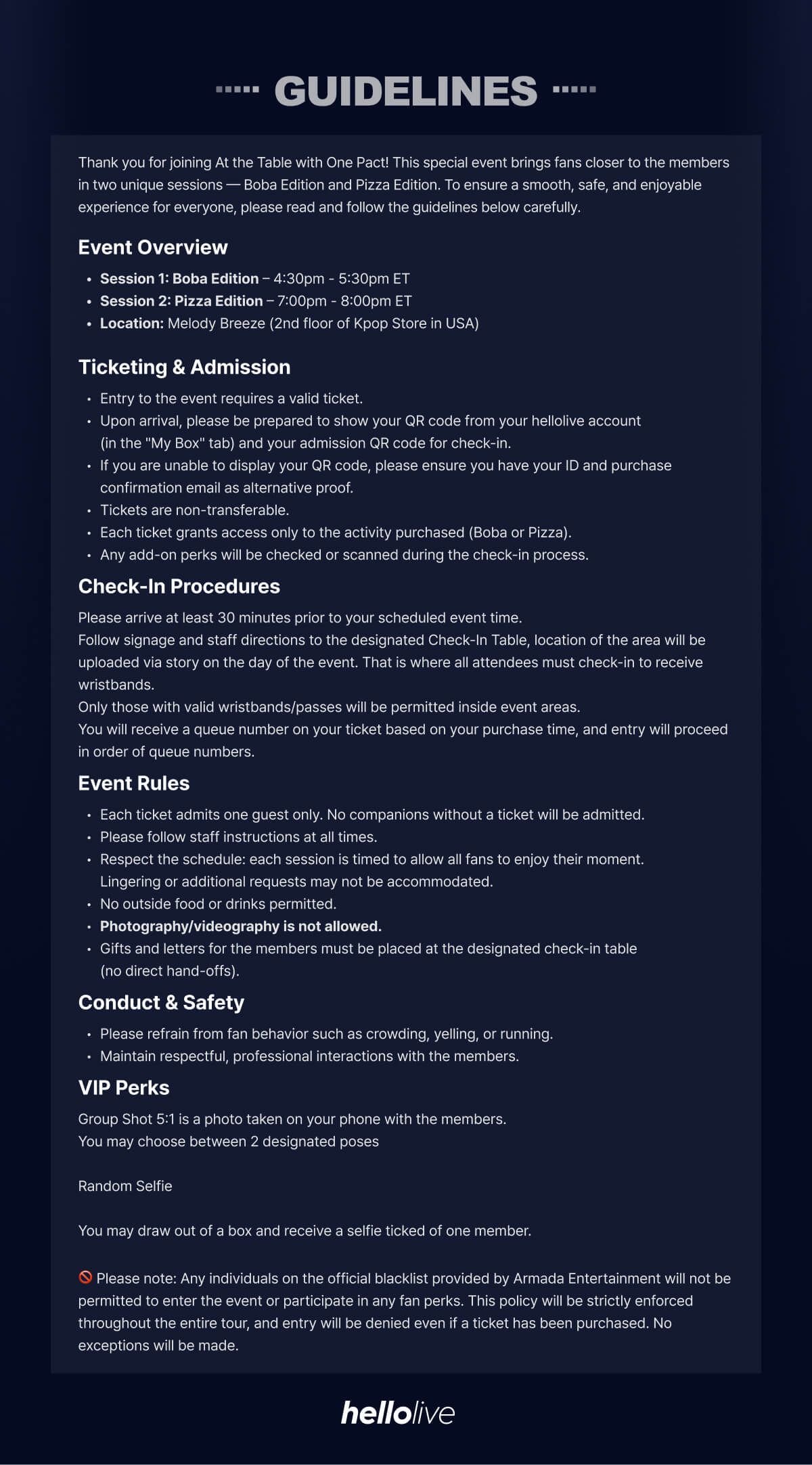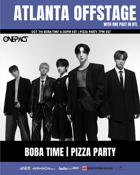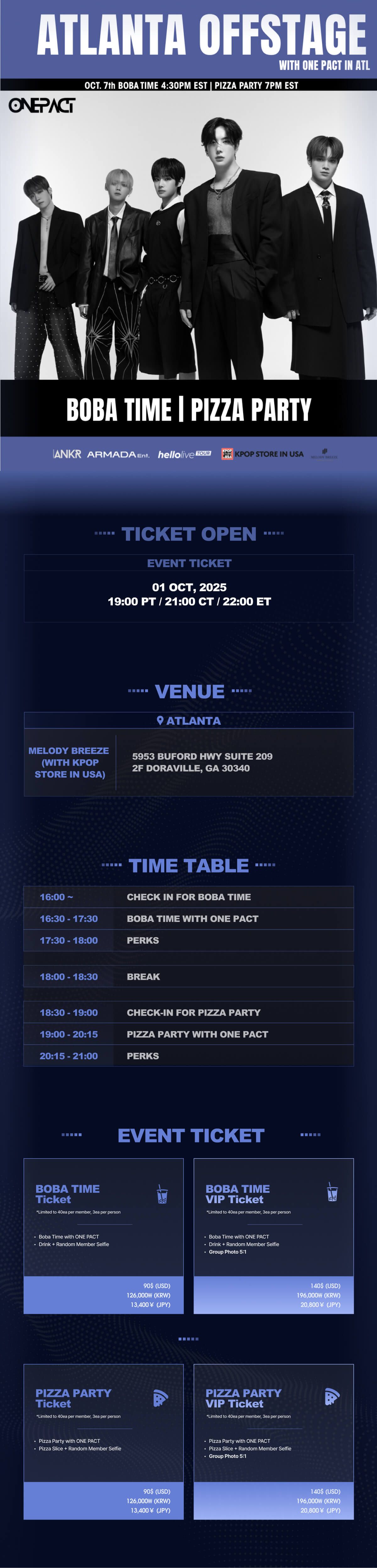 🧋 BOBA TIME & PIZZA PARTY 🍕 with ONE PACT in Atlanta🤍 ✅ Atlanta, GA, USA — OCT 7, 2025 ⏰ Event Overview - Session 1: Boba Edition > 16:30 ~ 17:30 - Session 2: Pizza Edition > 19:00 - 20:00 📍 LOCATION Melody Breeze (with Kpop Store in USA) (5953 Buford Hwy Suite 209 2F Doraville, GA 30340) 🎫 TICKET OPEN 01 OCT, 2025 | 19:00 PT / 21:00 CT / 22:00 ET ~ 07 OCT, 2025 | 00:00 PT / 02:00 CT / 03:00 ET 🔍 Hosted/Organized ARMADA ENT / hellolive