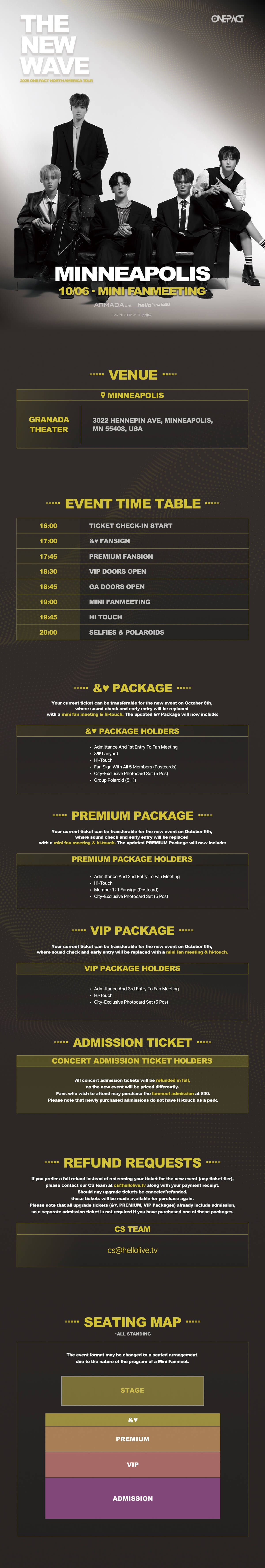 [📣 OFFICIAL MINNEAPOLIS CANCELLATION NOTICE] We are deeply sorry to announce that the September 24th, 2025 Minneapolis show will not be taking place as scheduled. We truly understand the disappointment this may cause, and we sincerely apologize for any inconvenience. To still create a meaningful moment together for the Minneapolis fans, a special mini fan meeting will be held on October 6th, 2025, where &♥ can meet ONE PACT up close. Tickets can be transferred to the new event, or refunded at your original point of purchase. Thank you for your patience, understanding, and support.