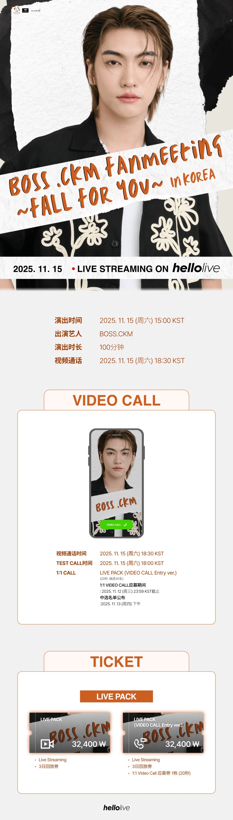 ⏰ 公演时间 2025. 11. 15 (周六) 15:00 KST 📞VIDEO CALL 2025. 11. 15 (周六) 18:30 KST *公布中奖者 2025. 11. 13(周四) 17:00 KST 以降 📞TEST CALL 2025. 11. 15 (周六) 18:00 KST 🎫 售票时间 2025. 11. 05 (周三) 18:00 KST ~ 🔍 主办/承办 W-STORY